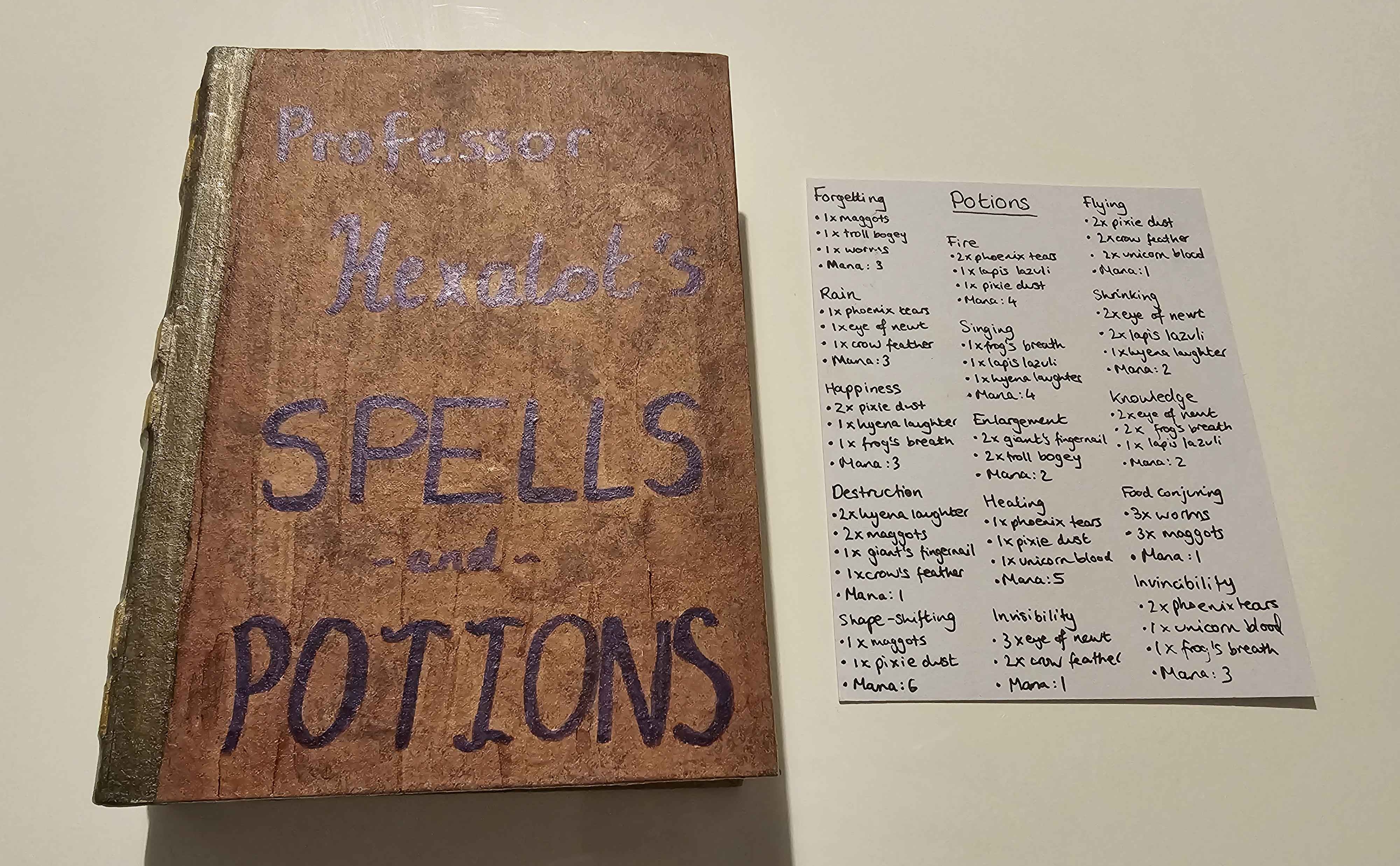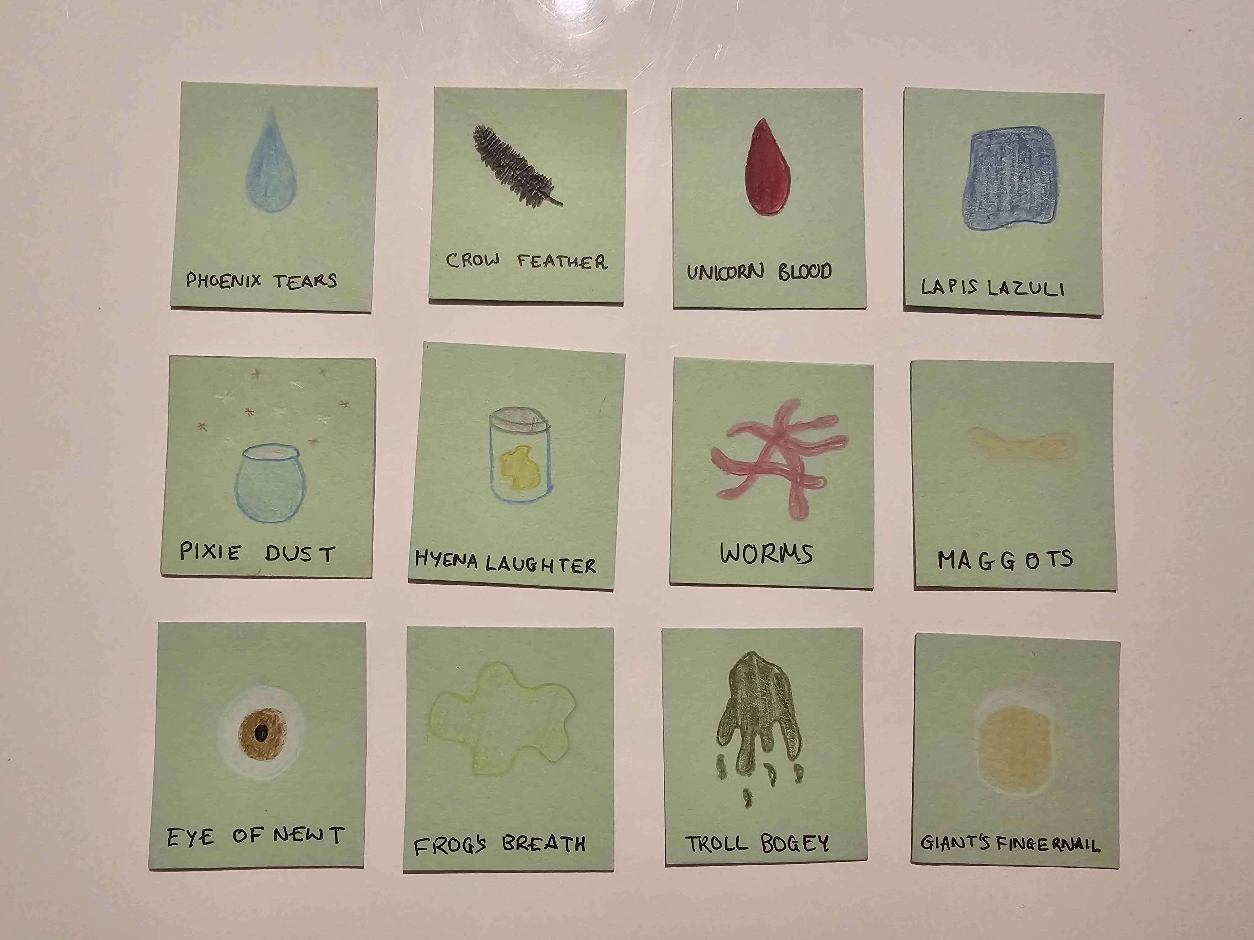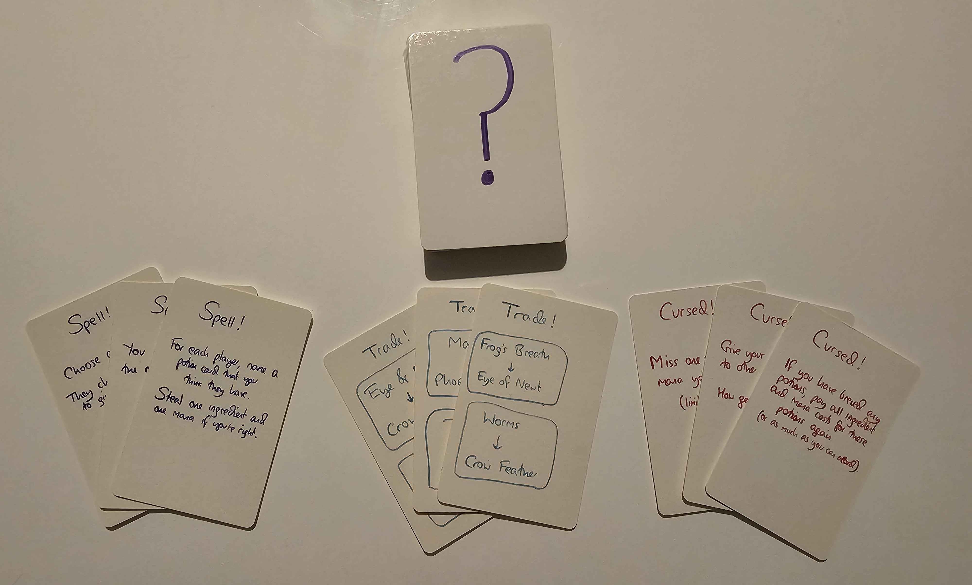 Potions require ingredients and mana to brew. In addition, the player must put all of the ingredients and mana into the cauldron and say the incantation at the bottom of the card. Although this doesn't contribute anything mechanically, it makes it feel much more special to brew a potion. A key mechanic is that brewing a potion forces all other players to immediately discard down to five ingredients (of their choice) - preventing players from hoarding ingredients and providing an incentive to brew early! This was a really successful mechanic.