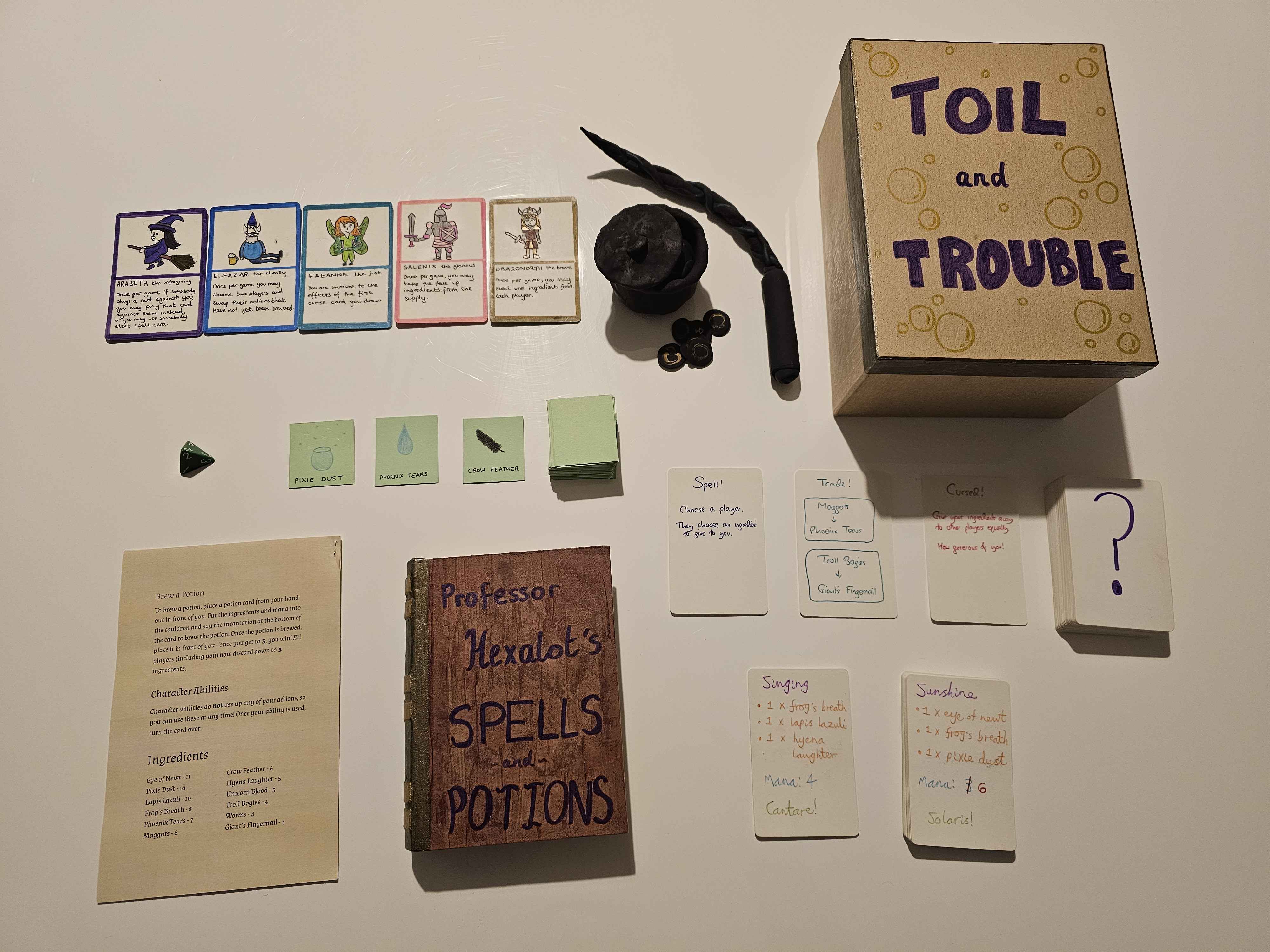 Toil and Trouble was created for the Warwick Game Design x Warwick Tabletop Board Games Jam 2024. The theme for the jam was "Taking Chances". On the team was: